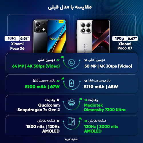 شیائومی Poco X7 در اوایل سال 2025 معرفی شد و بهسرعت توجه علاقهمندان به گوشیهای میانرده قدرتمند را به خود جلب کرد. این دستگاه با طراحی مدرن، قاب جلویی مجهز به شیشه Gorilla Glass Victus 2 و بدنه پشتی با دو نسخه پلاستیکی یا چرم مصنوعی، ترکیبی از زیبایی و دوام را ارائه میدهد. از طرفی مقاومت IP68 امنیت بالایی در برابر گردوغبار و آب تضمین میکند. نمایشگر 6.67 اینچی AMOLED با پشتیبانی از 68 میلیارد رنگ، نرخ نوسازی 120 هرتز، HDR10+ و دالبی ویژن، تجربه بصری شفاف و روانی فراهم میکند. روشنایی حداکثر 3000 نیت و رزولوشن 1220 در 2712 پیکسل، خوانایی و جزئیات بالایی را در هر شرایط نوری تضمین میکند. در بخش سختافزار، پردازنده بسیار بهینه Mediatek Dimensity 7300 Ultra با فناوری 4 نانومتری عملکرد روانی در اجرای برنامهها و بازیها ارائه میدهد. سیستمعامل اندروید 14 با رابط کاربری HyperOS، تجربهای مدرن و قابل شخصیسازی در اختیار کاربر قرار میدهد. دوربین اصلی سهگانه شامل سنسور 50 مگاپیکسلی با لرزشگیر اپتیکال، سنسور فوق عریض 8 مگاپیکسلی و ماکرو 2 مگاپیکسلی، کیفیت مطلوبی در عکاسی و فیلمبرداری 4K ارائه میدهد. دوربین سلفی 20 مگاپیکسلی نیز برای ثبت لحظات شخصی ایدهآل است. باتری 5110 میلیآمپرساعتی با شارژ سریع 45 واتی، امکان شارژ کامل در حدود 52 دقیقه را فراهم میکند. مجموعه امکانات ارتباطی ازجمله وایفای 6، بلوتوث 5.4، NFC و پورت مادون قرمز، Poco X7 را به گزینهای کامل و ارزشمند در بازار میانردهها تبدیل کرده است.
